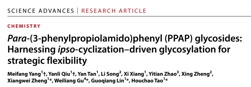 7月25日,天游ty8线路官网创新中药研究院林国强院士团队陶厚朝课题组在Science Advances上在线发表了题为“Para-(3-Phenylpropiolamido)phenyl (PPAP) Glycosides: Harnessing Ipso-Cyclization-Driven Glycosylation for Strategic Flexibility”的研究论文。该研究基于原位关环驱动的糖苷化理念,开发了一类新型糖基给体,为复杂糖类化合物的策略合成提供了新方法和新思路。