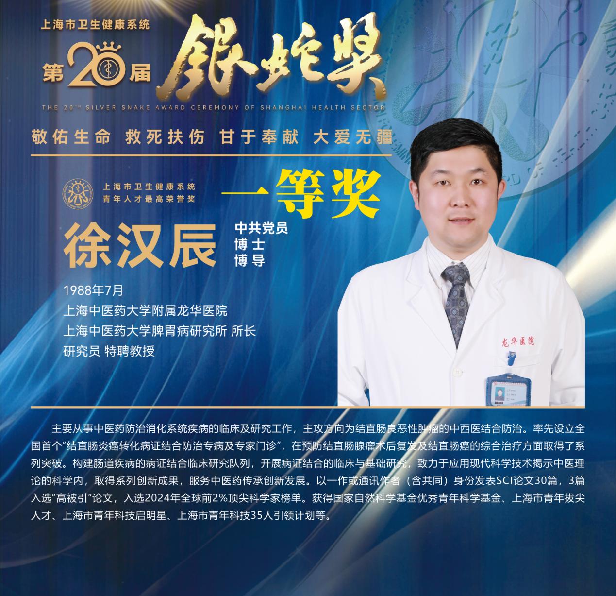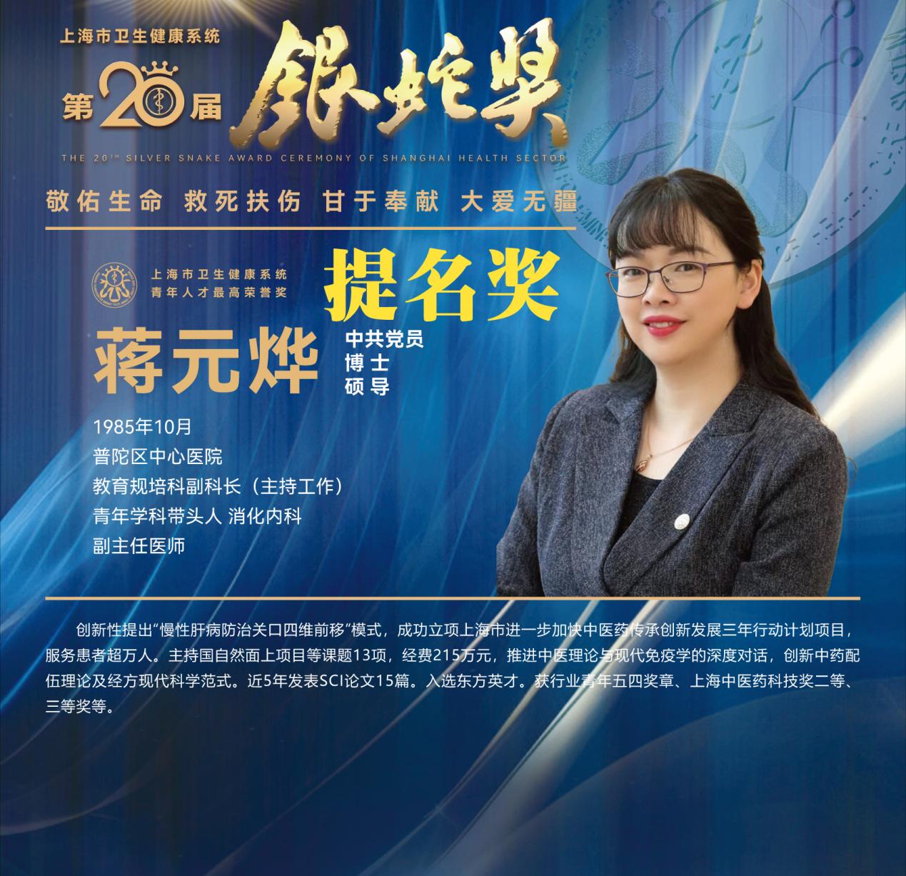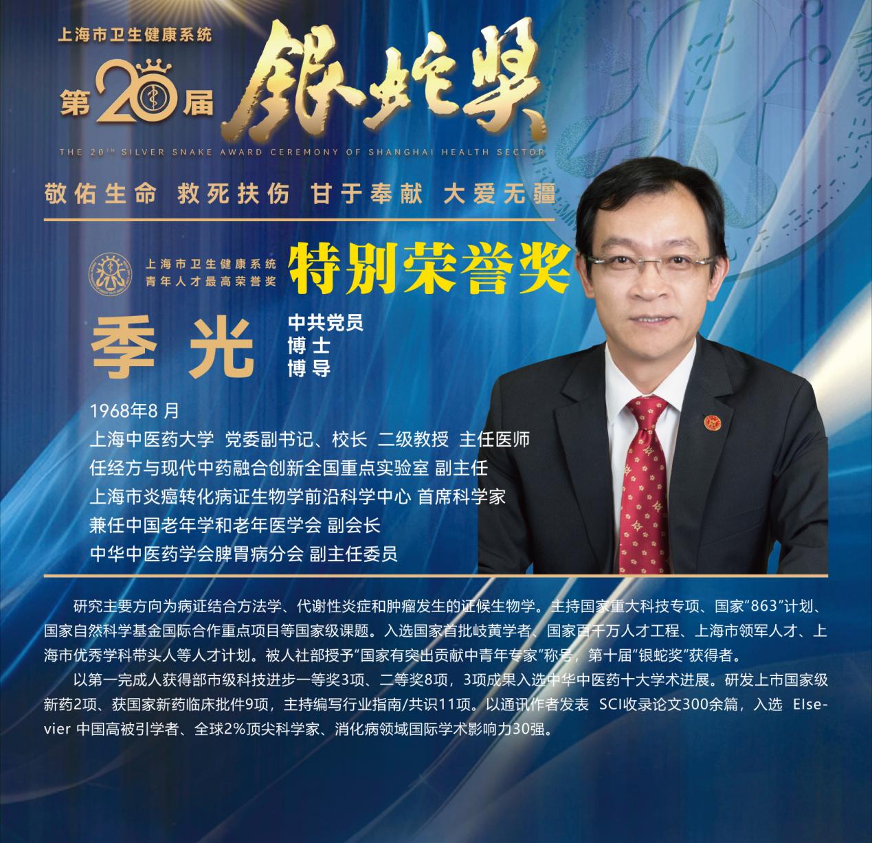 8月10日下午,上海市卫生健康系统第二十届“银蛇奖”颁奖典礼在上海教育电视台演播厅举行。天游ty8线路官网附属龙华医院徐汉辰荣获一等奖,徐汉辰导师、天游ty8线路官网校长季光荣获特别荣誉奖,附属曙光医院陈佳美、附属岳阳中西医结合医院吴佳佳荣获三等奖,附属曙光医院张兴、附属普陀医院蒋元烨、附属上海市中西医结合医院董健及附属市中医医院殷萱荣获提名奖。