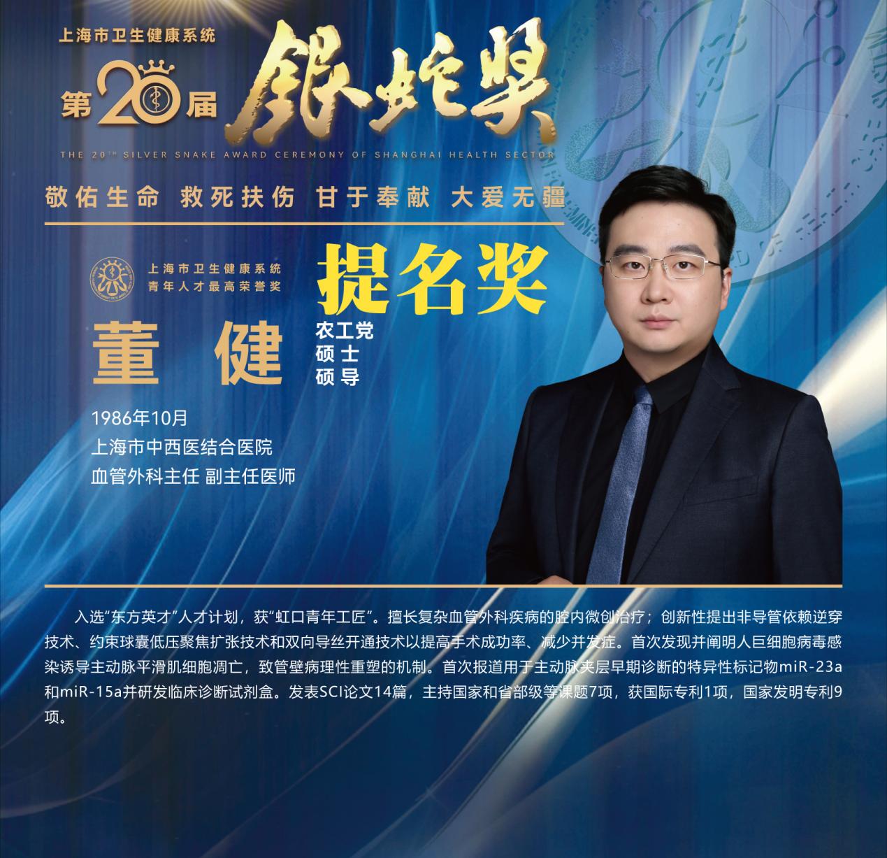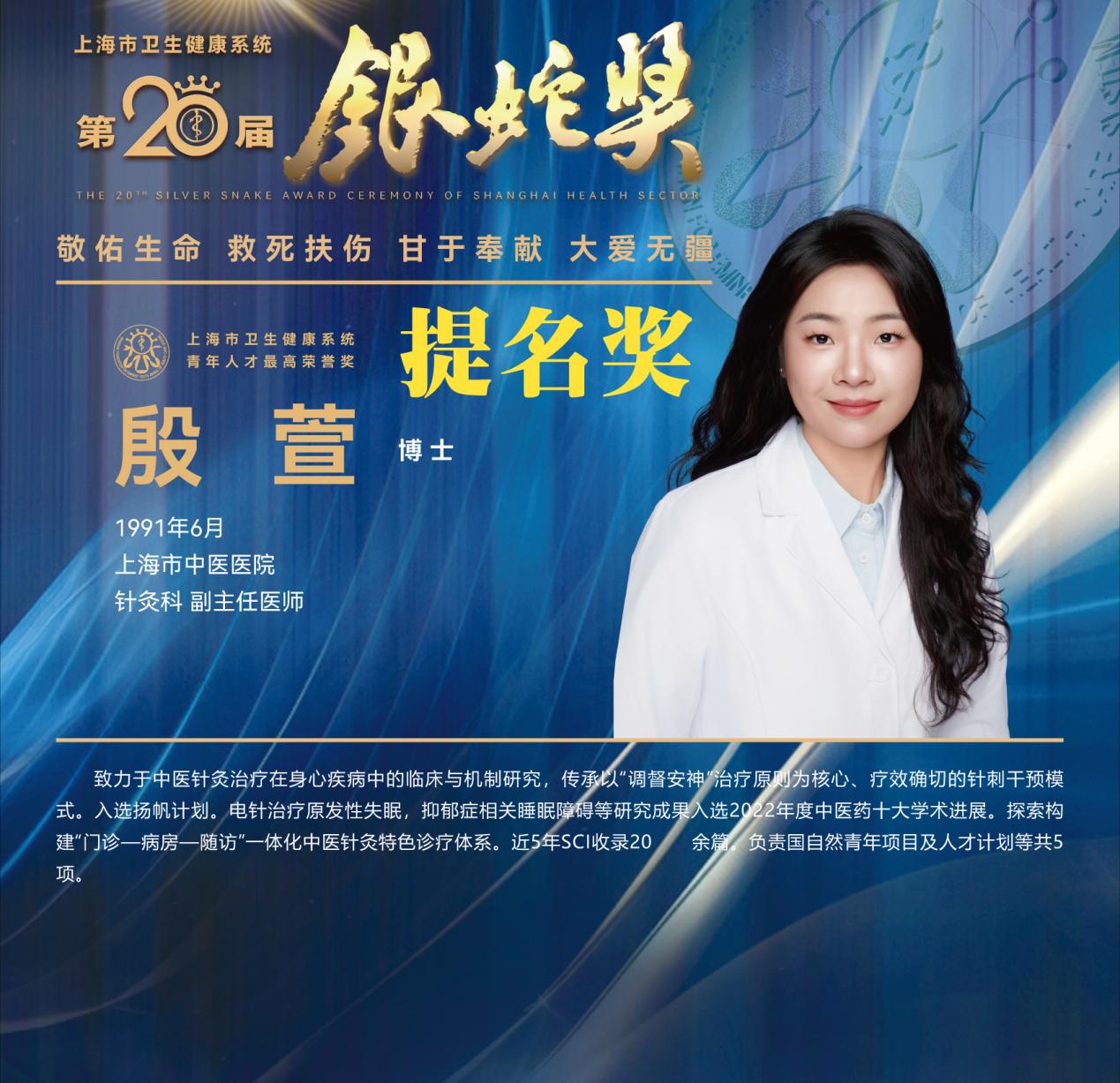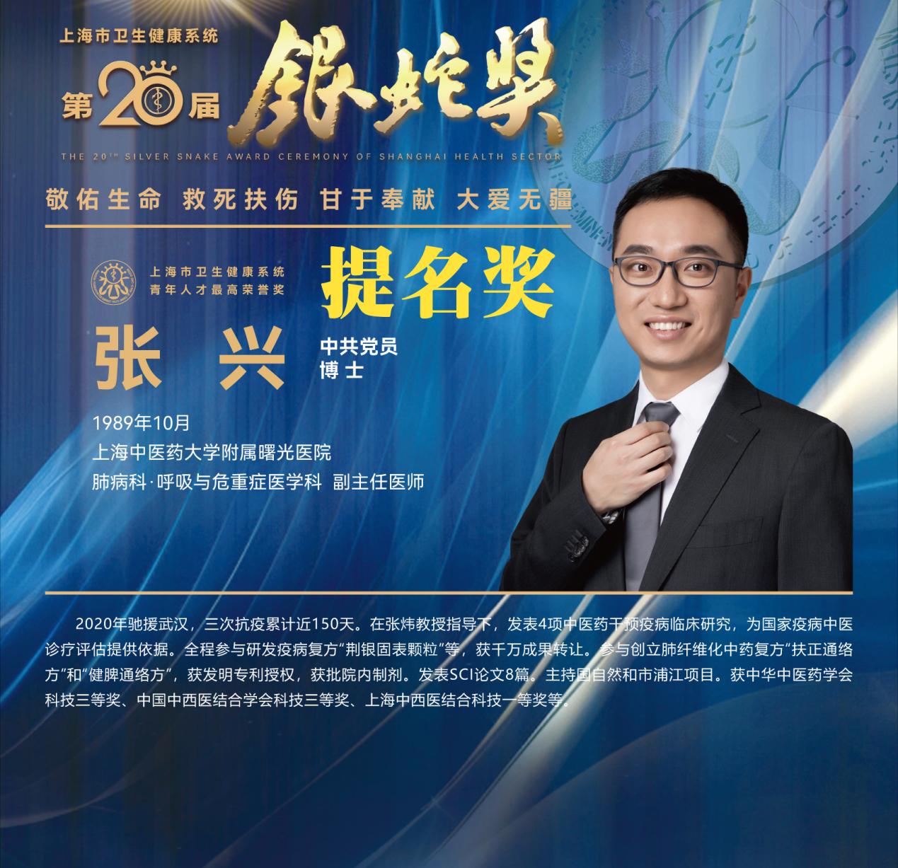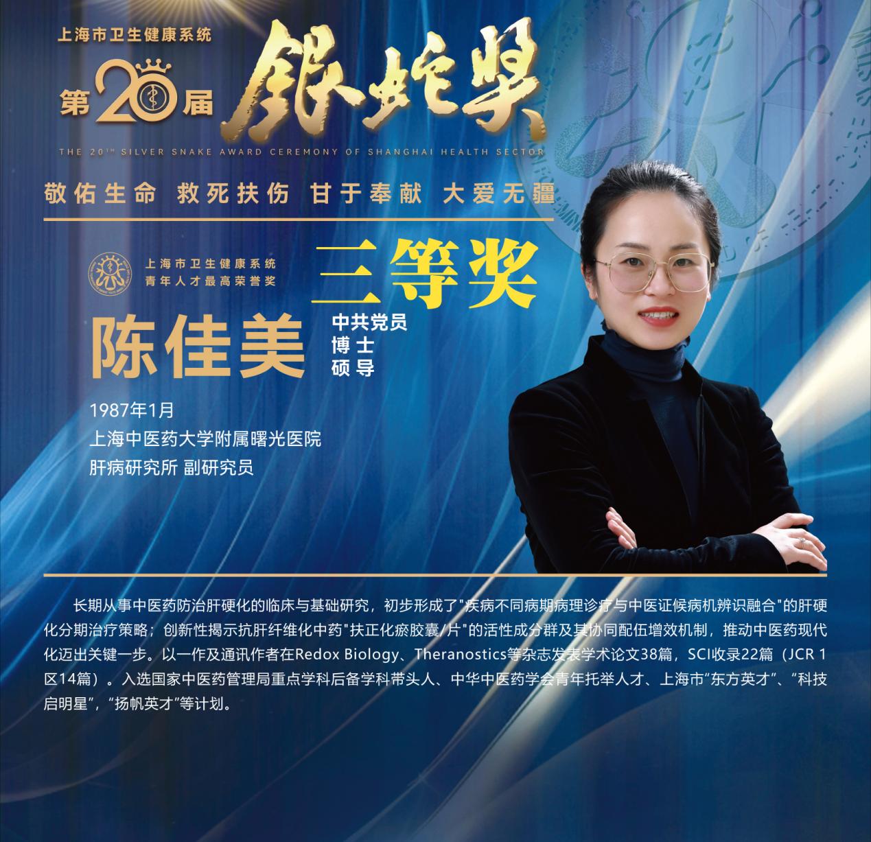 8月10日下午,上海市卫生健康系统第二十届“银蛇奖”颁奖典礼在上海教育电视台演播厅举行。天游ty8线路官网附属龙华医院徐汉辰荣获一等奖,徐汉辰导师、天游ty8线路官网校长季光荣获特别荣誉奖,附属曙光医院陈佳美、附属岳阳中西医结合医院吴佳佳荣获三等奖,附属曙光医院张兴、附属普陀医院蒋元烨、附属上海市中西医结合医院董健及附属市中医医院殷萱荣获提名奖。
