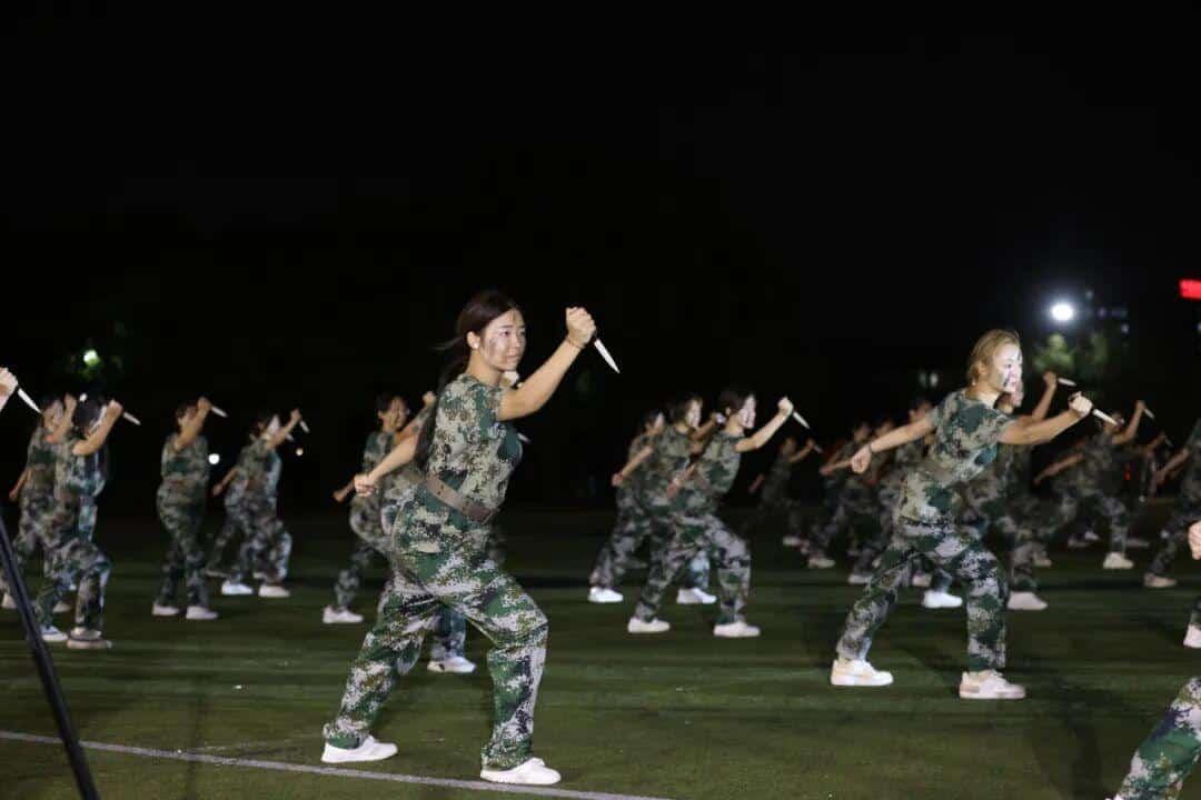 擒敌拳和匕首操表演方阵进行了训练成果展示,同学们整齐划一的动作和雷霆万钧的气势赢得了现场阵阵掌声。