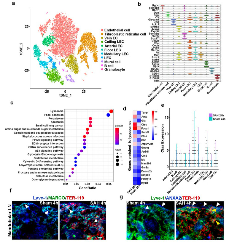 厘清降解路径:团队观察到,与 SAH 后 4 小时相比,下颌淋巴结内的血管外红细胞在 SAH 后 24 小时会发生降解,且被降解的红细胞碎片主要与颈部淋巴结的淋巴管内皮细胞(LEC)共定位。同时,体外研究进一步发现,淋巴管内皮细胞具备吞噬红细胞的能力,并能将其传递至溶酶体进行降解;