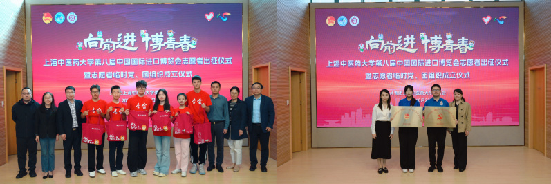 党员志愿者代表和团员志愿者代表面对党旗和团旗再次重温入党、入团誓词,表达了听党话、跟党走的决心。全体志愿者齐声承诺:“以真诚的热情服务各国来宾,以自信和智慧展现岐黄风采,以最饱满的精神,投入进博服务工作。”
