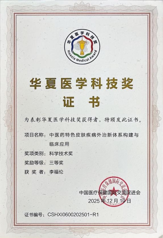 12月20日,2025年度华夏医学科技奖颁奖大会在北京举行,天游ty8线路官网附属岳阳中西医结合医院李福伦教授作为项目负责人,联合成都大学、东华大学、上海市第七人民医院,完成的项目“中医药特色皮肤疾病外治新体系构建与临床应用”荣获华夏医学科技奖三等奖。