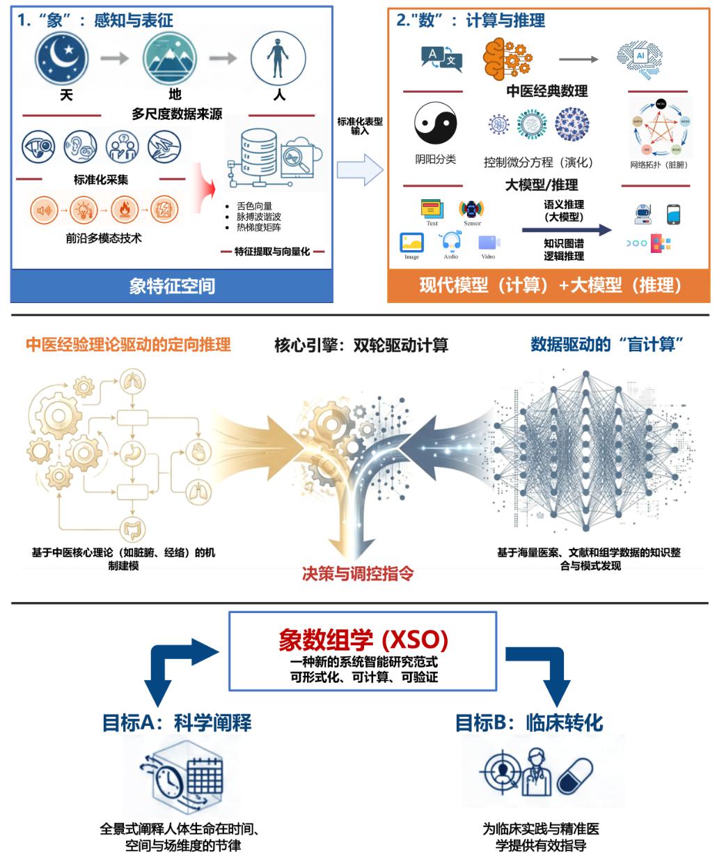 二、象数组学:双引擎驱动的中医药智能研究新框架。象数组学的基本逻辑,是将中医对“象”(生命状态的表现)的感知与“数”(现代计算技术)的分析深度结合。这一研究框架主要由两个引擎驱动:①象组学——全方位的“高精度感知系统”:它拓展了传统中医“望闻问切”的局限,借助声波、光学、热力学、电磁学等现代传感技术,把以往相对模糊的“气色、声息、脉象”以及外界时令环境的变化,转化为看得见、摸得着的多维度客观数据。这样一来,人体从宏观到微观的生理变化就能被精准记录和存储。②数组学——聪明的“大脑计算引擎”:它负责将中医理论转化为计算机能懂的科学模型。一方面,它利用人工智能技术去解析“阴阳五行”等经典中医理论的动态变化,建立预测模型;另一方面,它基于中医“理-法-方-药”的经典诊疗逻辑,进行智能分析和推理。通过这种大数据的“算”与中医理论的“推”相结合,“象数组学”能够为个体生成专属的虚拟模型(数字孪生),动态模拟生命节律与疾病进展,从而更好地指导“同病异治、异病同治”的个性化诊疗。