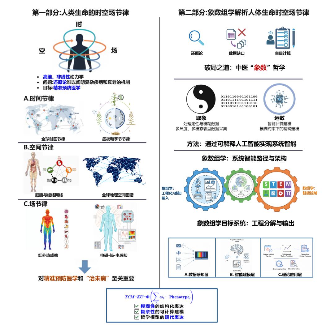 生命本质是时间、空间、物理场三维动态耦合的复杂巨系统。传统还原论医学聚焦单一器官或分子靶点,在解析慢性病、衰老等复杂系统性问题时面临挑战;而中医自古以“人”为核心,凭借“天人合一”“天人相应”的整体观,天然适配生命节律的多维特性。以往,中医的这些经典理念多停留在宏观哲学思辨与主观经验层面,较难实现精准的客观量化。为了破解这一难题,王拥军教授、施杞教授团队融合人类表型组学、系统生物学与中医“象数”哲学,提出了可量化、可计算的“象数组学”概念。这一研究体系旨在将中医抽象的生命经验转化为系统级的客观数据,用现代科学语言阐释“天人相应”的生命状态,推动中医药从“经验医学”向“数据医学”跨越,为中医药现代化发展提供了“上中医方案”。