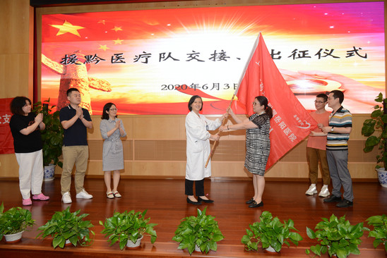 此次党课上还进行了援黔医疗队交接、出征仪式,由针灸科副主任医师张倩、心血管内科副主任医师朱岩峰、康复医学科治疗师卢铖组建成立了第二批援黔医疗队,两批援黔医疗队完成了队旗的交接任务。全国脱贫攻坚取得重大胜利,经国务院扶贫开发领导小组同意,贵州省人民政府通告,正式批准习水县退出贫困县,医院先后派出两批次援黔医疗队和对口帮扶专家团,为习水县的卫生健康事业发展作出了积极的贡献。
