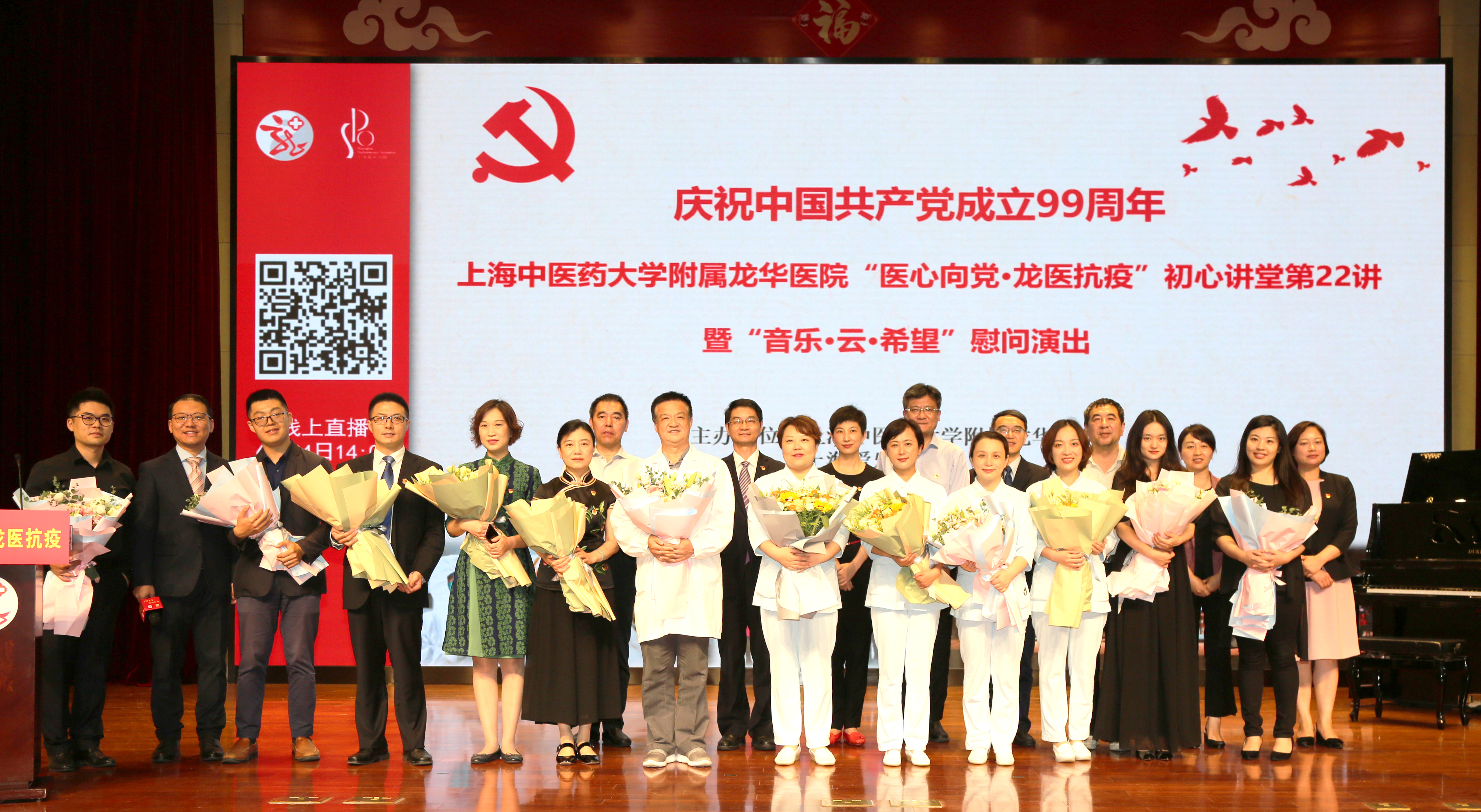 6月24日,为庆祝中国共产党成立99周年,附属龙华医院“医心向党•龙医抗疫”初心讲堂第二十二讲暨“音乐•云•希望”慰问演出在龙华医院远志楼三楼会议室举行。天游ty8线路官网副校长杨永清,上海爱乐乐团、上海师范大学人文学院、工商银行上海市徐汇支行、龙华烈士纪念馆等多家党建共建单位领导,龙华医院党政领导班子、职能科室负责人、支部书记及党员代表、民主党派及统战团体代表等近150人参加现场会议。特殊时期,本次大会采用了线上线下相结合的方式,广大党员、学生、职工、党建共建单位成员等3700余人通过网络直播在线听课。