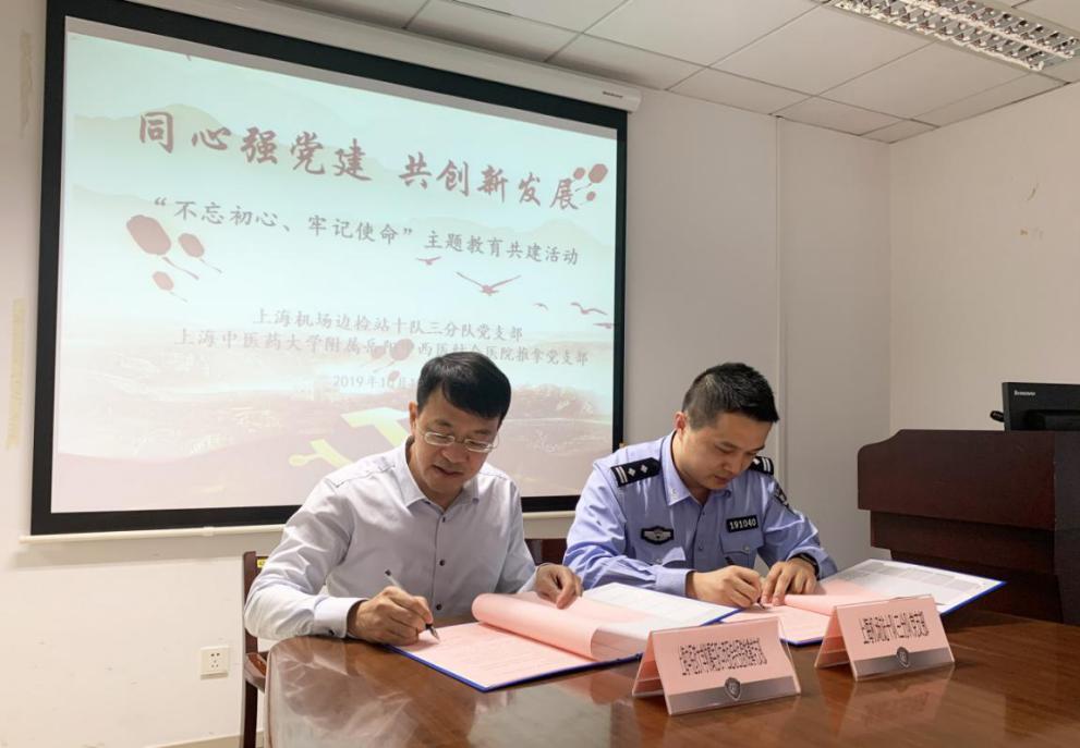 魏崇海和孙武权分别介绍各自党支部的发展现状及第二批“不忘初心、牢记使命”主题教育开展情况。上海机场边检站十队三分队党支部张嘉彤介绍上海机场边检站的历史以及他们作为国家首批移民官的日常工作流程,增进大家对出入境管理工作的了解。随后,双方党支部书记共同签署共建协议。孙武权和与会的推拿党支部党员们还为分别上海机场边检站工作人员带来脊柱健康保养科普讲座和脊柱疾病健康咨询服务。(岳阳医院)