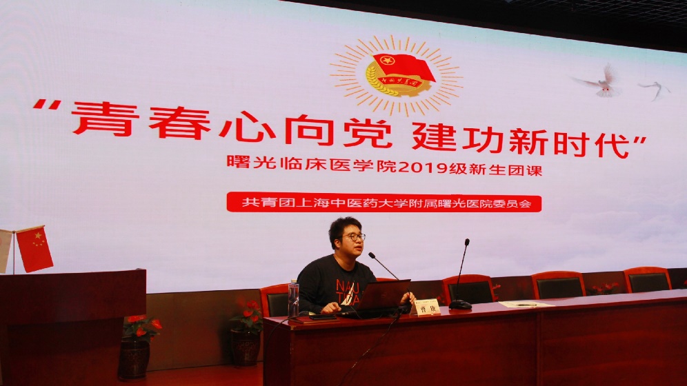 院团委书记曹康为新生带来“青春心向党,建功新时代”团课,从“五四运动的历史意义”“我们的初心与使命”“海派中医与四明精神”等几个方面展开,帮助新生明确新时代合格共青团员的目标——争做时代先锋,共创祖国美好未来。