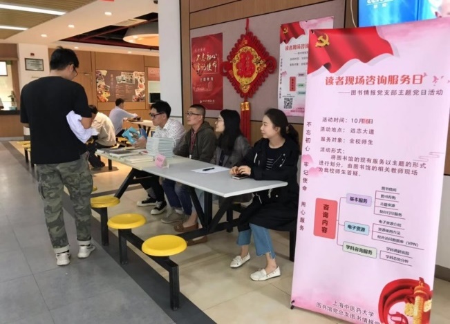 1016日中午,图书馆党总支图书情报党支部结合党员的岗位特色,面向学校师生开展了一次读者现场咨询服务。咨询内容主要包括图书馆的基本服务、电子资源及学科分析等。为了让更多师生能够知晓此次活动,享受此项服务,图书情报党支部将活动地点设在人流量大的学生食堂一楼入口处,并选在中午师生用餐高峰时段开展此项活动。