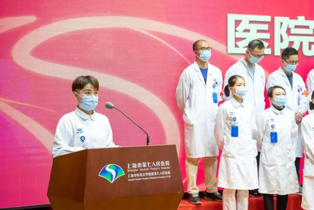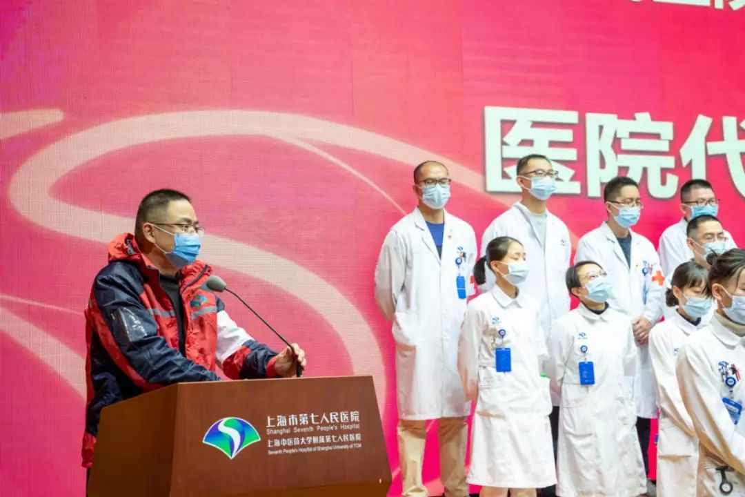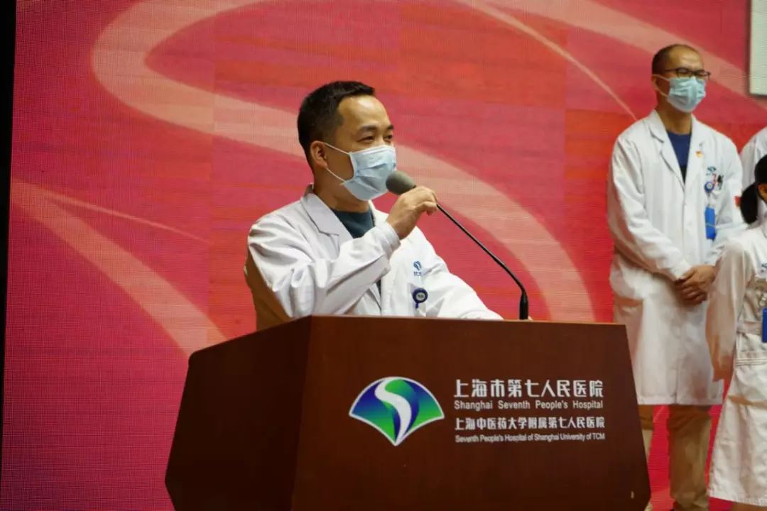 浦东新区卫生健康委员会副书记、副主任陈英首先宣读了本次出征援鄂的通知。附属第七人民医院院长王杰宁宣读此次50名出征人员名单。50名援鄂队员有序上台,他们斗志昂扬、毫无畏惧。根据市卫健委下发“关于组派医疗队援助湖北应对新冠肺炎疫情通知”要求,强化第七人民医院党员在援鄂期间集中统一管理和服务,让党旗在防疫一线高高飘扬。经七院党委研究,在出征仪式中成立援鄂医疗队临时党支部。同时,医院党委书记徐玉英宣读临时党支部名单,并领读出征誓词。