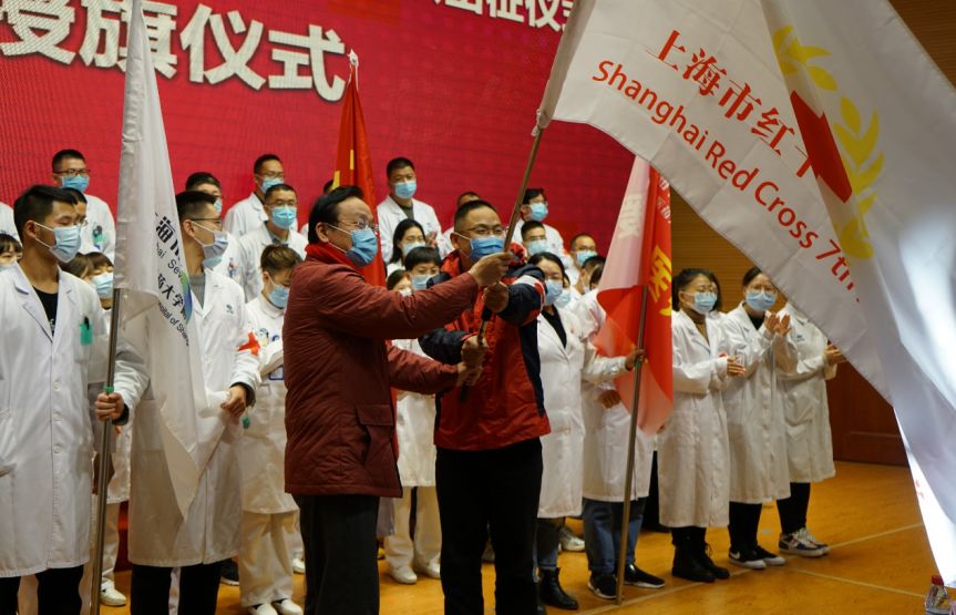 浦东新区红十字会党组书记、常务副会长顾赛花为援鄂代表佩戴红十字徽章。授旗仪式上,王杰宁授上海市第七人民医院医疗队队旗,援鄂医疗队副队长张晓丹接旗。浦东新区卫生健康委员会书记、主任李新明授天游ty8线路检测中心登录附属第七人民医院旗、党旗,援鄂医疗队副队长邸英莲接旗。天游ty8线路检测中心登录校长徐建光授上海红十字第七人民医院旗,援鄂医疗队队长林研接旗。