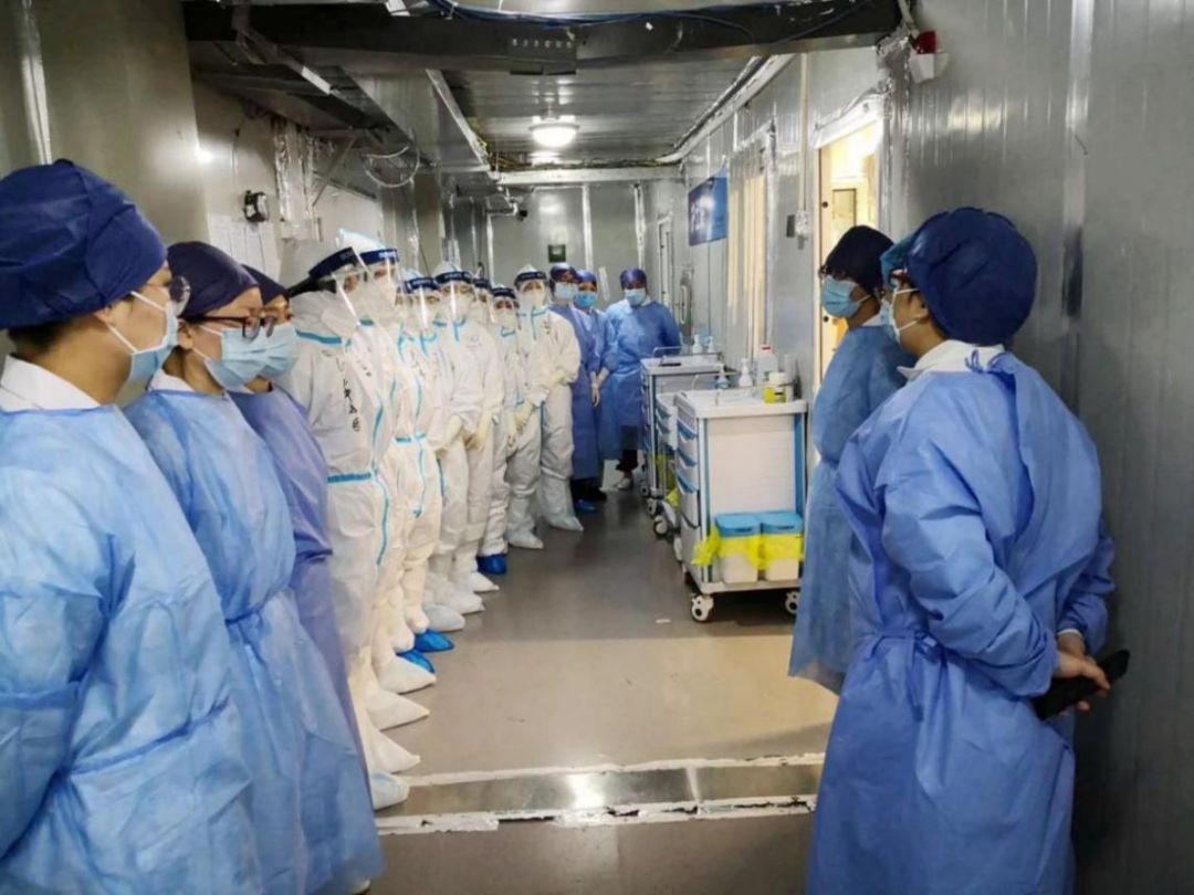 雷神山医院的隔离病房是负压病房,相较于普通医院在救治传染性疾病病人上优势明显。队员们克服了全新系统操作和同龙华医院在人员配合上的生疏,第一班结束时,出仓的队员们衣服都湿透了,但没有一个人有怨言,只有简单的调侃和互相的鼓励。等到十点第一班陆续离开病房,朱颖才发现自己和队友们居然已经“绝食”快八个小时了。有些病人病情出现反复,医疗队内外围的对讲机响个不停,队员们密切关注患者情况。