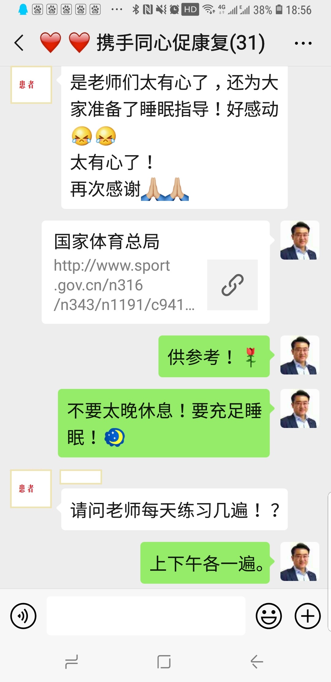 为了把中西医结合康复训练方法更好用于上海市新冠肺炎患者,同时不影响对新冠肺炎患者的一线诊治工作,康复团队建立了微信群,由上海市公共卫生临床中心的医生向患者提供微信群纸质二维码,五十多位轻型新冠肺炎患者手机扫码入群。患者入群后,康复团队提供健身气功养肺方的训练视频和文字讲解,并做一般性呼吸训练和运动指导、健康咨询。康复团队还通过放松疗法、音乐治疗、正念冥想、情感宣泄等多种方式,缓解患者的焦虑、恐慌情绪,营造轻松快乐的氛围。同时,团队通过简单的电子问卷,了解患者在健身气功养肺方训练及其他干预后的咳嗽、呼吸困难、胸闷、情绪、食欲和睡眠障碍等的缓解情况,以判断各种康复指导的安全性、有效性,以及时修正完善。康复团队的十几位成员,每天从早晨7点到夜里12点,一直通过微信平台陪伴、指导和鼓励着远在金山区上海市公共卫生临床中心的几十位新冠肺炎患者们。在训练健身气功养肺方后,群里的新冠肺炎患者们纷纷表示,“呼吸顺畅多了”“感觉睡眠明显改善!浑身变得更轻了,咳嗽症状也有所缓解!”“练完后浑身筋骨舒适”……