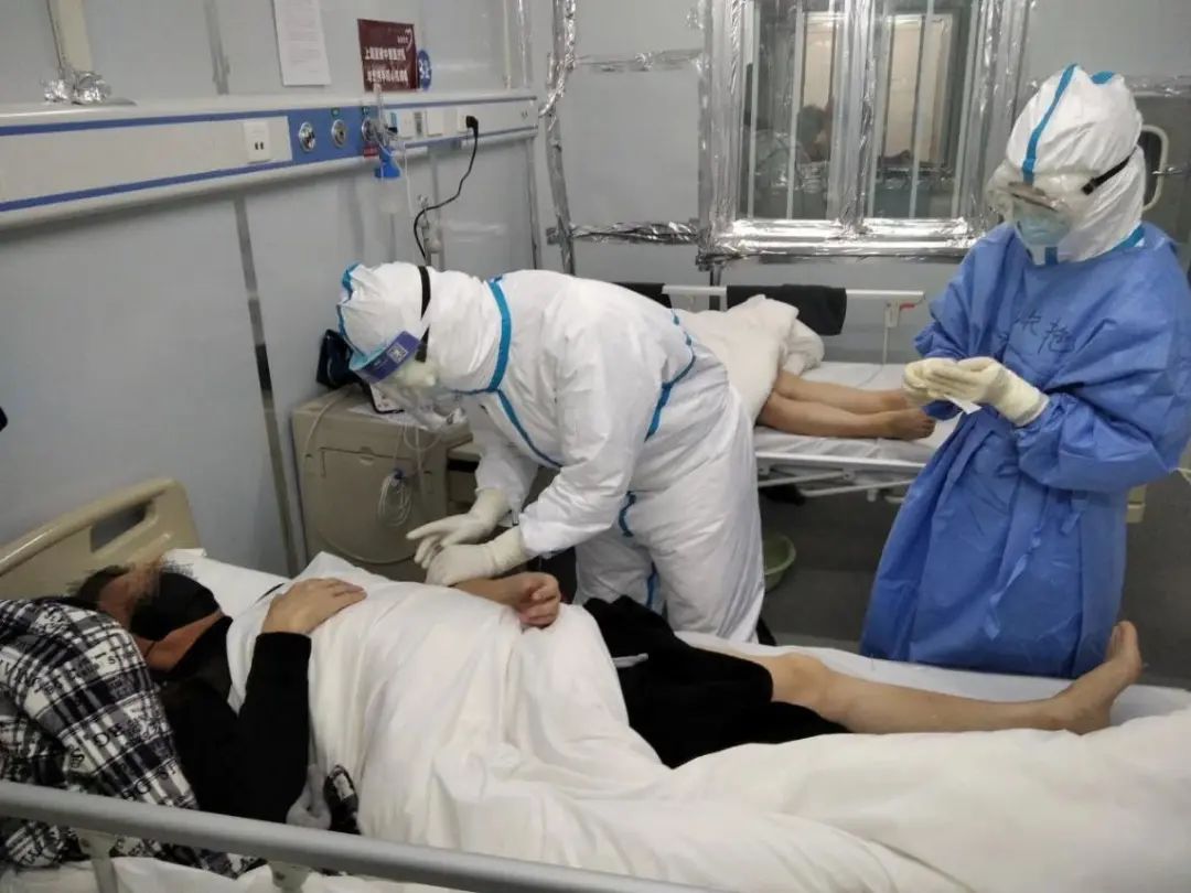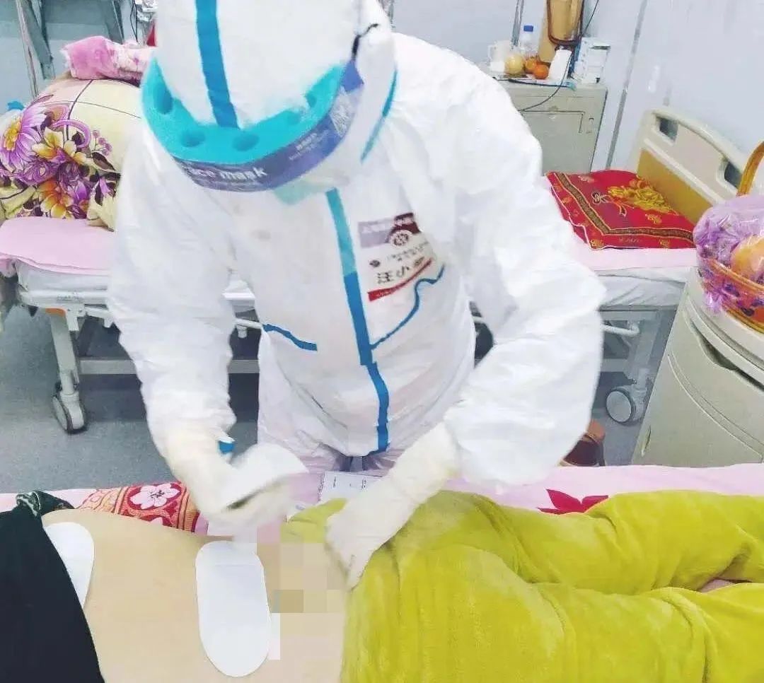 曙光医院肾病科护士长汪小冬为患者在背部肺俞等多处穴位进行敷贴,并适度推拿。由于长时间保持相同姿势,使力挪动患者,十几分钟操作下来,汪小冬已经是气喘吁吁、满头大汗了,护目镜也蒙上了一层水雾。患者经过这几天内服中药、外施敷贴的治疗,气喘、排便情况有了改善,她们都冲医生们竖大拇指。