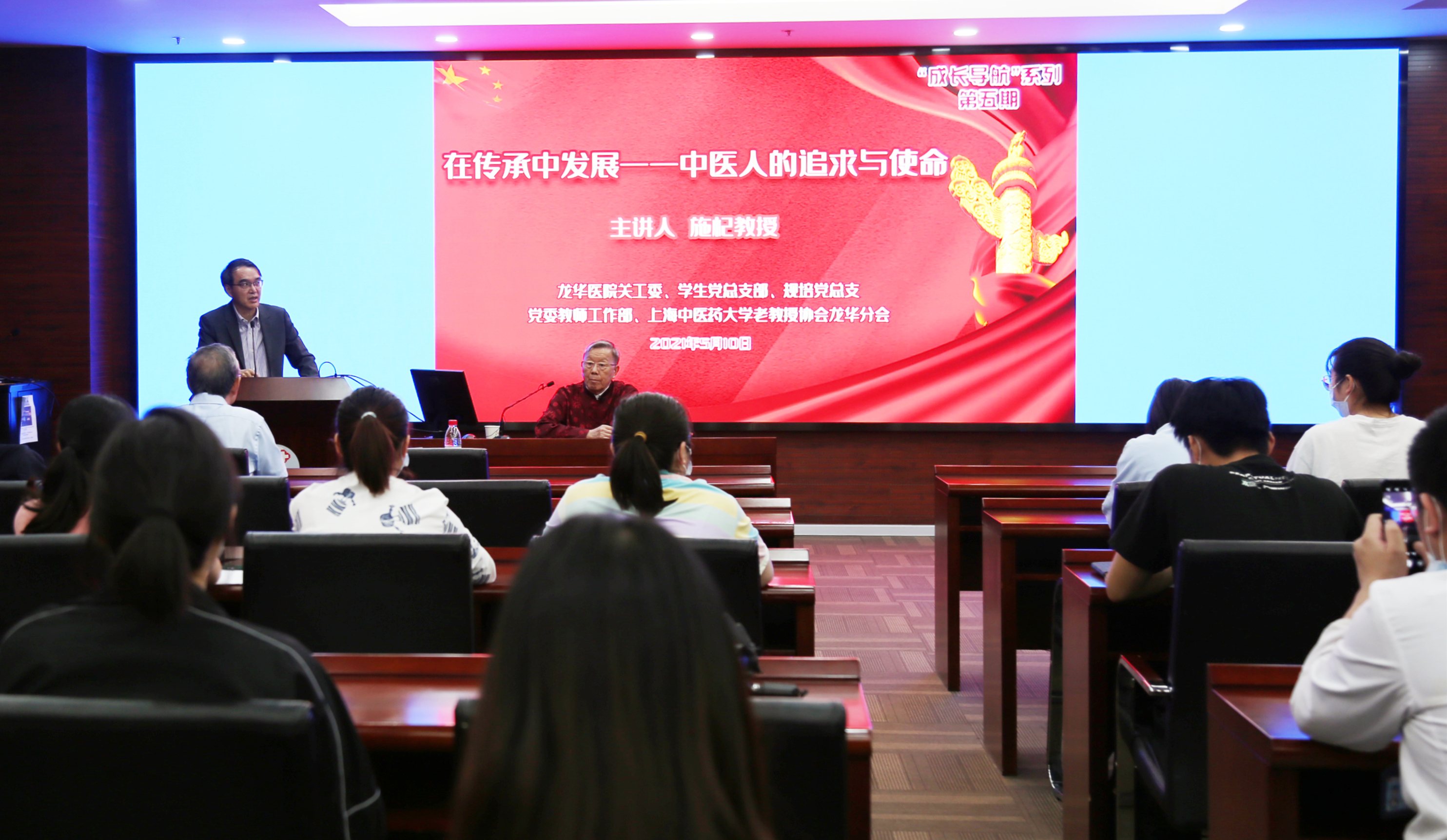 迎接建党100周年,围绕党史学习教育,充分发挥医院老专家、老教授关心下一代成长的作用,5月10日下午,附属龙华医院关工委、学生党总支、规培党总支、党委教师工作部、天游ty8线路检测中心登录老教授协会龙华分会联合举办的“岐黄名家讲故事”第三期活动在医院12号楼一楼会议室举行,邀请上海市名中医、天游ty8线路检测中心登录终身教授、龙华临床医学院服务学生成长导师团“启德明智导师团”团长施杞教授作《在传承中发展——中医人的追求与使命》主题讲座,讲座由龙华医院党委书记刘胜主持,医院相关职能部门负责人以及青年医师、学生党员和规培住院医师党员等参加。
