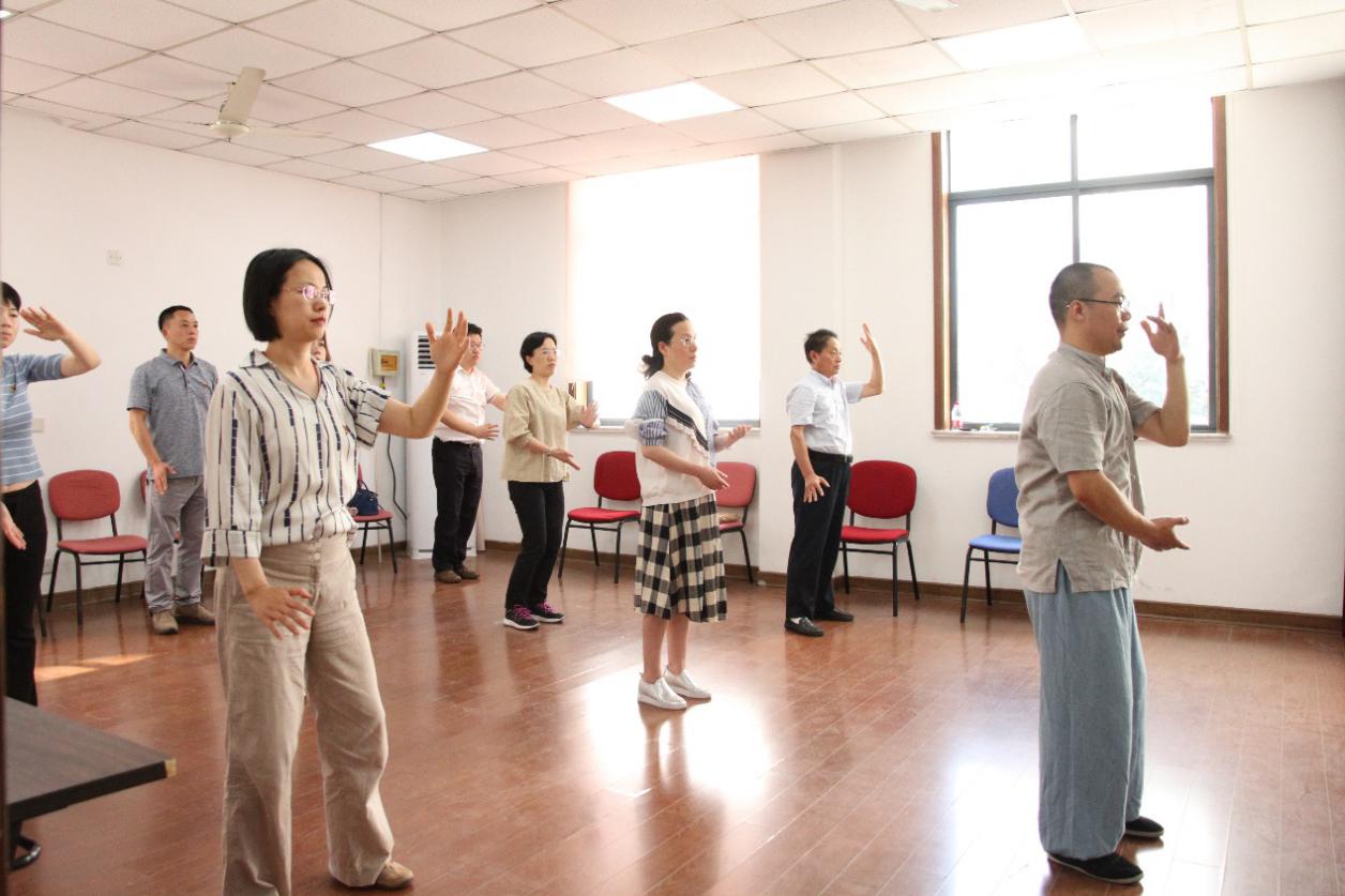 气功研究所孙磊带领徐汇区医疗保障局机关党支部的党员们体验传统功法八段锦。