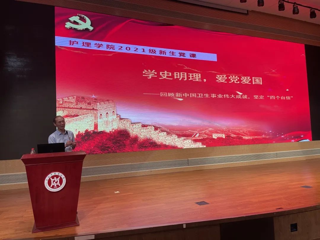 9月6日下午,护理学院党总支书记史美育在图书馆四楼报告厅,为护理学院2021级新生作主题为“学史明理,爱党爱国——回顾新中国卫生事业伟大成就,坚定‘四个自信’”的“书记第一课”。会议由护理学院党总支副书记李媛主持,护理学院新生辅导员和全体2021级学生参加。