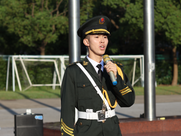 升旗仪式在中国人民解放军进行曲中拉开帷幕,国旗护卫队迈着整齐的步伐,意志坚定,目光炯炯。随着出旗令响,师生行注目礼,奏唱中华人民共和国国歌,鲜艳的五星红旗缓缓升起。