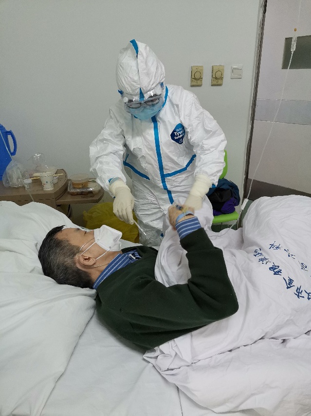 上海市第一批援鄂医疗队队员 龙华医院呼吸科护士长甄暐主管护师在为患者做治疗