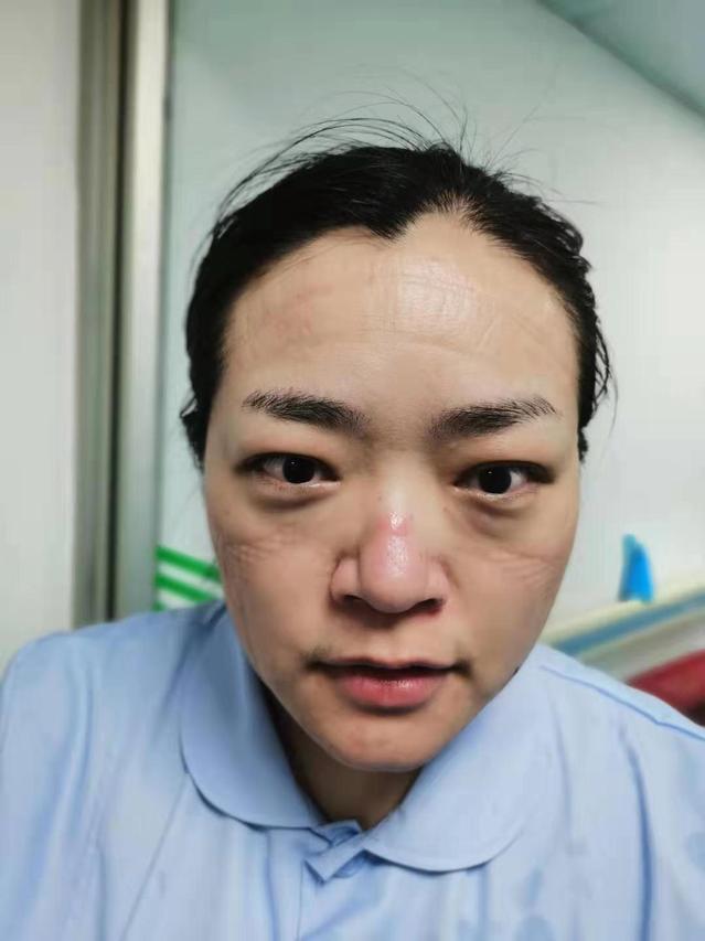 曙光医院黄凤作为上海市第一批援鄂医疗队支援金银潭医院,摘下口罩和护目镜后脸上的印痕