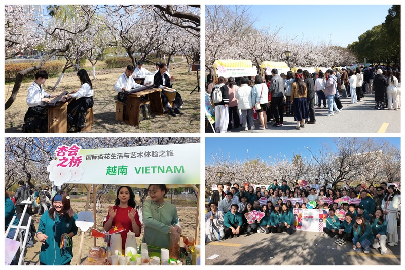 “杏会之桥”国际杏花生活与艺术体验之旅在一曲轻快的笛子独奏中开启!200多名国际学生穿梭其中,来自11个国家的留学生身着各自国家民族服饰,展示本国杏花元素与健康理念。手工互动体验区成为跨文化交流的实践场所,以“指尖上的文明互鉴”为设计理念,轮流展演杏花茶引、杏仁点心、杏味香囊等药食同源技艺,并现场教做杏花书签、杏花香扇,把上中医的春天名片递向世界。