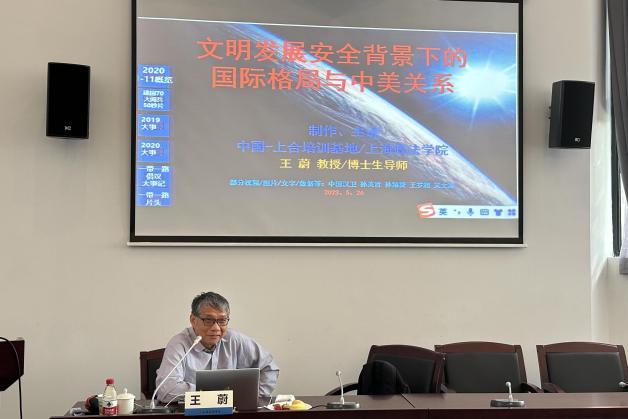 参观结束后,培训班邀请了上海政法学院王蔚教授作“文明发展安全背景下的国际格局与中美关系”专题报告。在报告中王蔚分析了当前中美关系、中国与欧洲主要国家、日本和印度等国之间错综复杂的关系。王蔚认为,在充满不确定性的时代背景下,安全与发展仍然是国际关系的大趋势。坚定地推动构建人类命运共同体,积极促进全球安全与发展、和平与治理,这是我们在中国共产党带领下走出困局、取得胜利的关键所在。