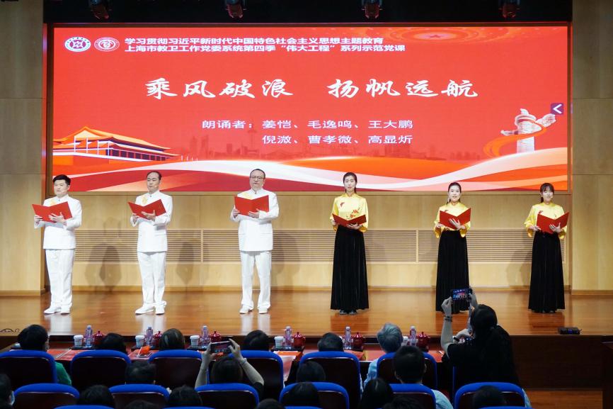 党课第一篇章为“追溯回望 积蓄伟力”,舞蹈《绣红旗》和《故事里的中国 永不消逝的电波》配音表演饱含深情,再现了革命先辈前赴后继、视死如归的感人场景。医院青年医务工作者朗诵诗歌《乘风破浪 扬帆起航》,展现了青年人心怀“国之大者”,勇敢接过新时代接力棒的使命担当。
